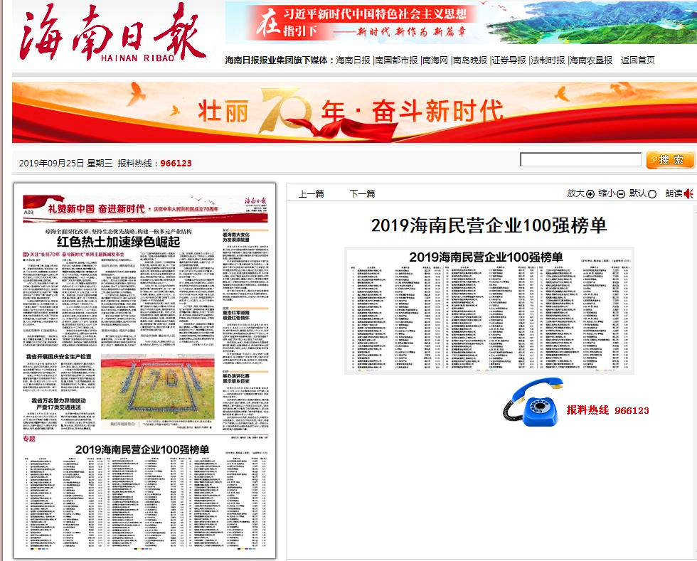 2019海南省民營企業(yè)100強證書
