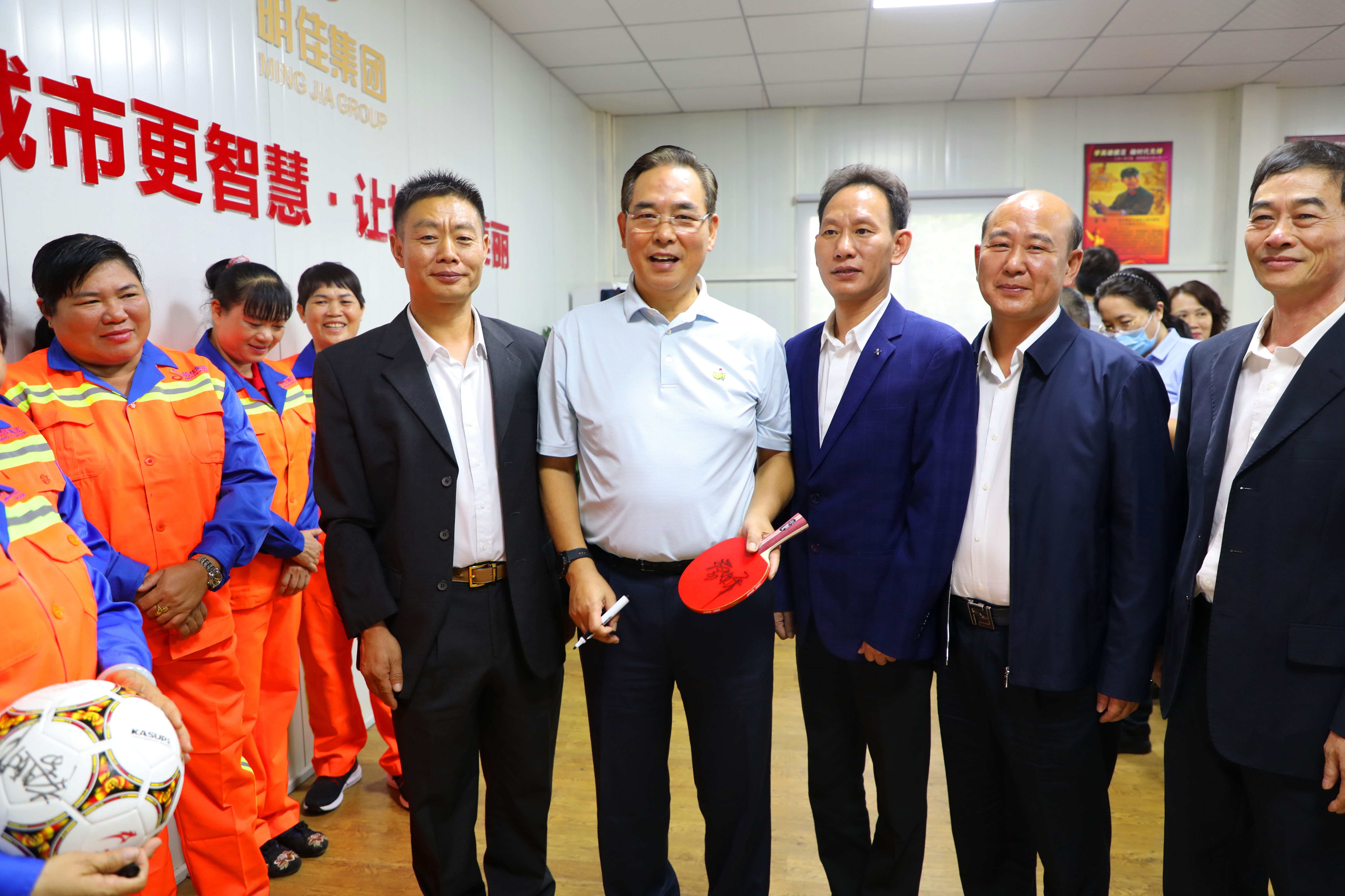 座談會結(jié)束后,明佳集團一些職工表示非常喜愛乒乓球及足球運動,一直都是蔡副主席的粉絲,希望獲得蔡振華副主席的親筆簽名。蔡副主席非常親切地為他們簽名,并與之合影留念。