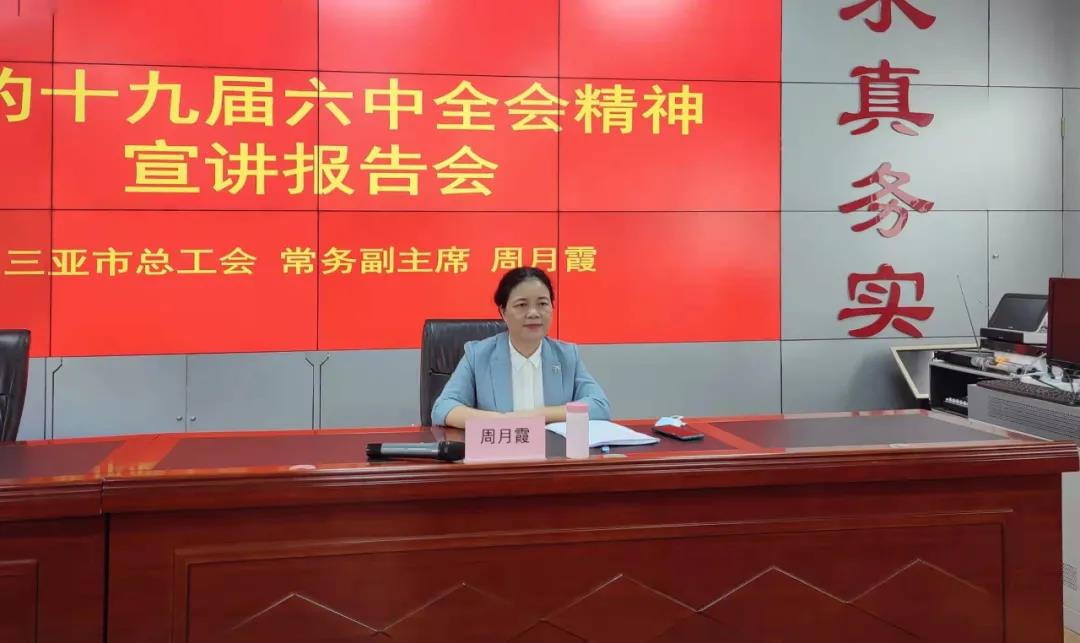 宣講會上,周月霞從黨的十九屆六中全會的重大意義、“兩個”確立、以“四個”歷史時期、“三次”飛躍、“十個”堅持等方面,結(jié)合三亞市第八次黨代會精神和工會工作實際,對全會精神作了深入淺出的闡釋和全面系統(tǒng)的解讀。她表示,希望大家能夠通過學(xué)習(xí),更好地從黨的百年奮斗中看清楚過去我們?yōu)槭裁茨軌虺晒、弄明白未來我們怎樣才能繼續(xù)成功,激發(fā)奮進(jìn)新時代、邁好新征程、建功自貿(mào)港的斗志和豪情。