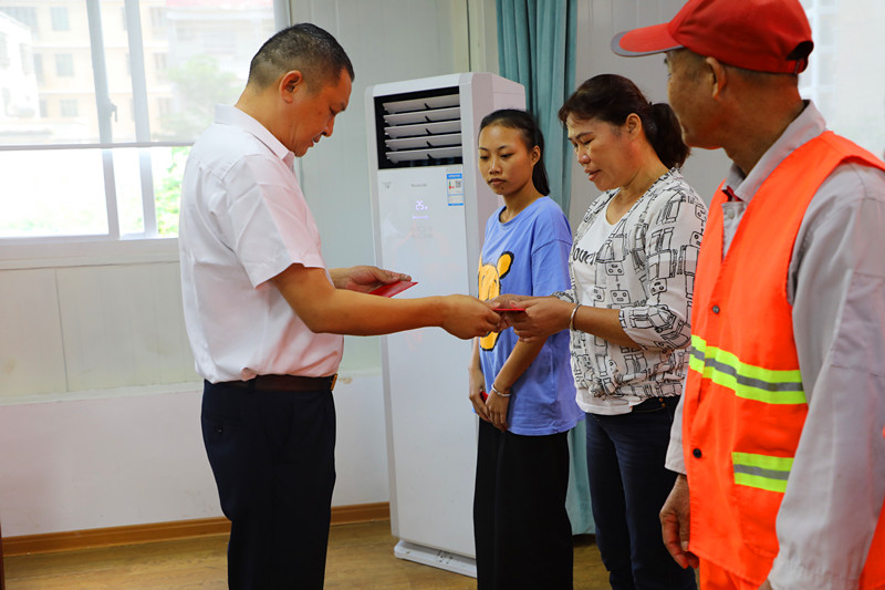 (生產(chǎn)部經(jīng)理楊洪向?qū)W生家長發(fā)放助學金)