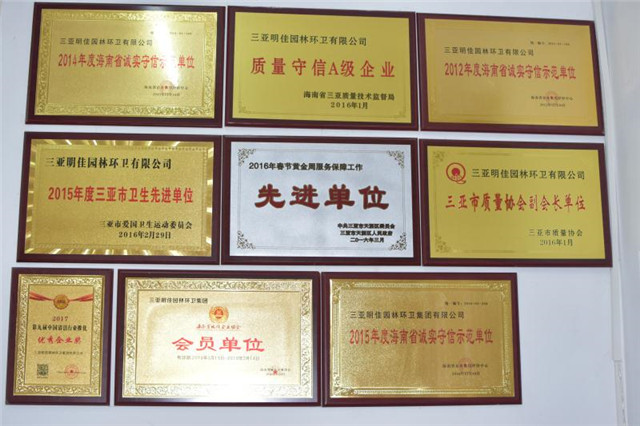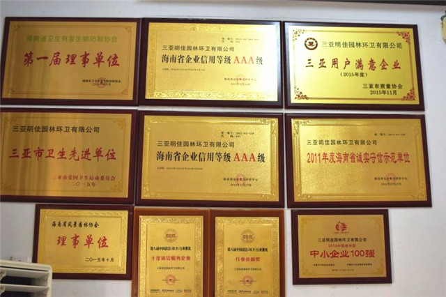 目前母公司連續(xù)五年被海南省企業(yè)信用評定中心評定為信用AAA等級單位,并榮獲中國清潔清洗行業(yè)國家一級資質、城市環(huán)境衛(wèi)生經(jīng)營服務A級資質、城市園林綠化三級資質,被中國清潔行業(yè)推選為國家三星級企業(yè)、十佳清潔服務企業(yè)、杰出貢獻企業(yè),并榮獲2016年中國清潔行業(yè)百強品牌,成為中國清潔行業(yè)常務理事單位、中國衛(wèi)生有害生物防制協(xié)會會員單位、中國城市環(huán)境衛(wèi)生協(xié)會會員單位、海南省衛(wèi)生協(xié)會理事單位、三亞市環(huán)境保護協(xié)會副會長單位,公司先后多次獲得國家、省、市獎勵和表彰40余次,成功在海南省股權交易中心掛牌,代碼:90777,并積極籌劃在新三板上市,已真正成為海南省環(huán)衛(wèi)行業(yè)的龍頭企業(yè)。